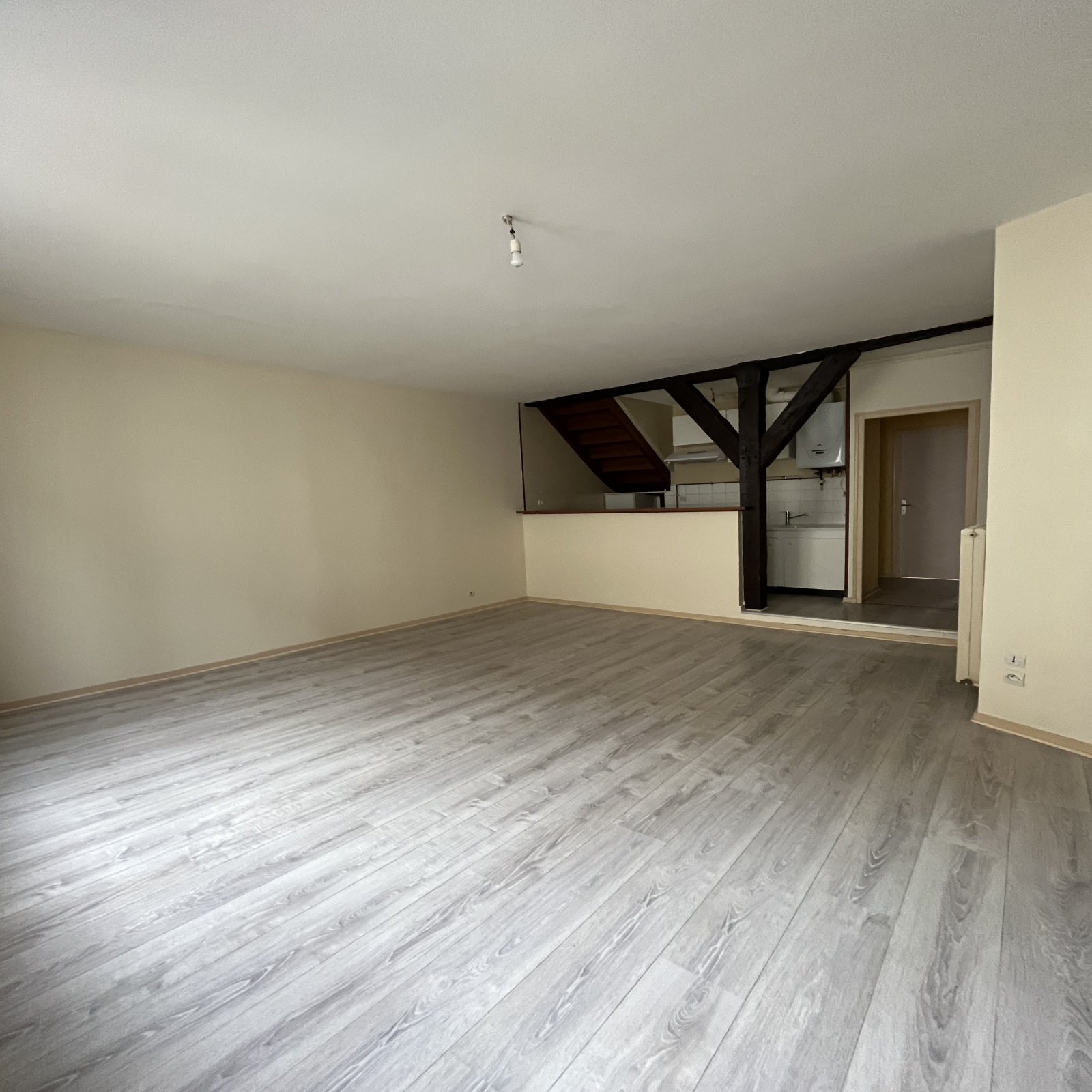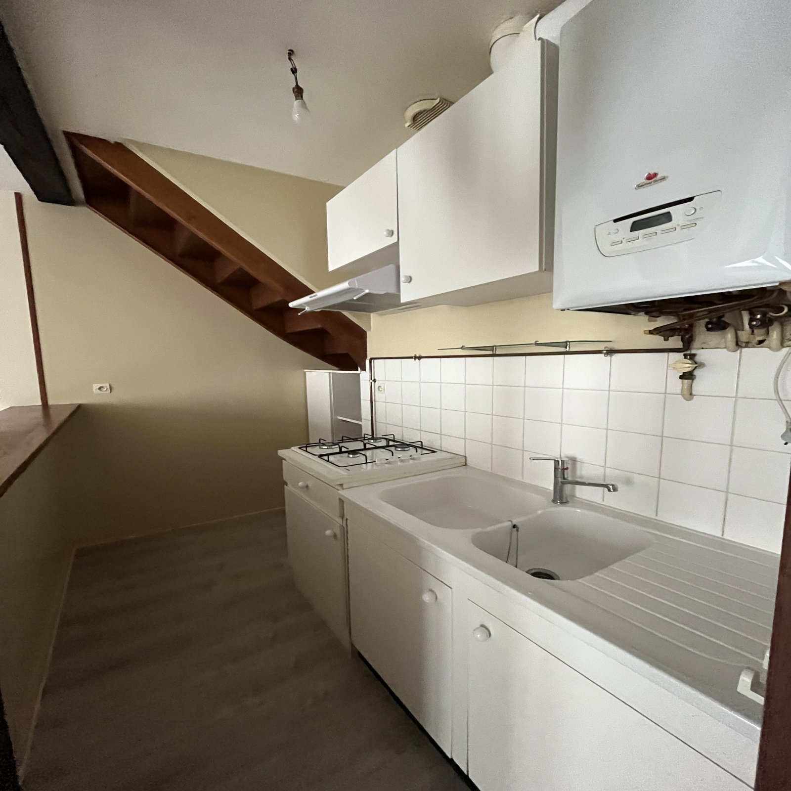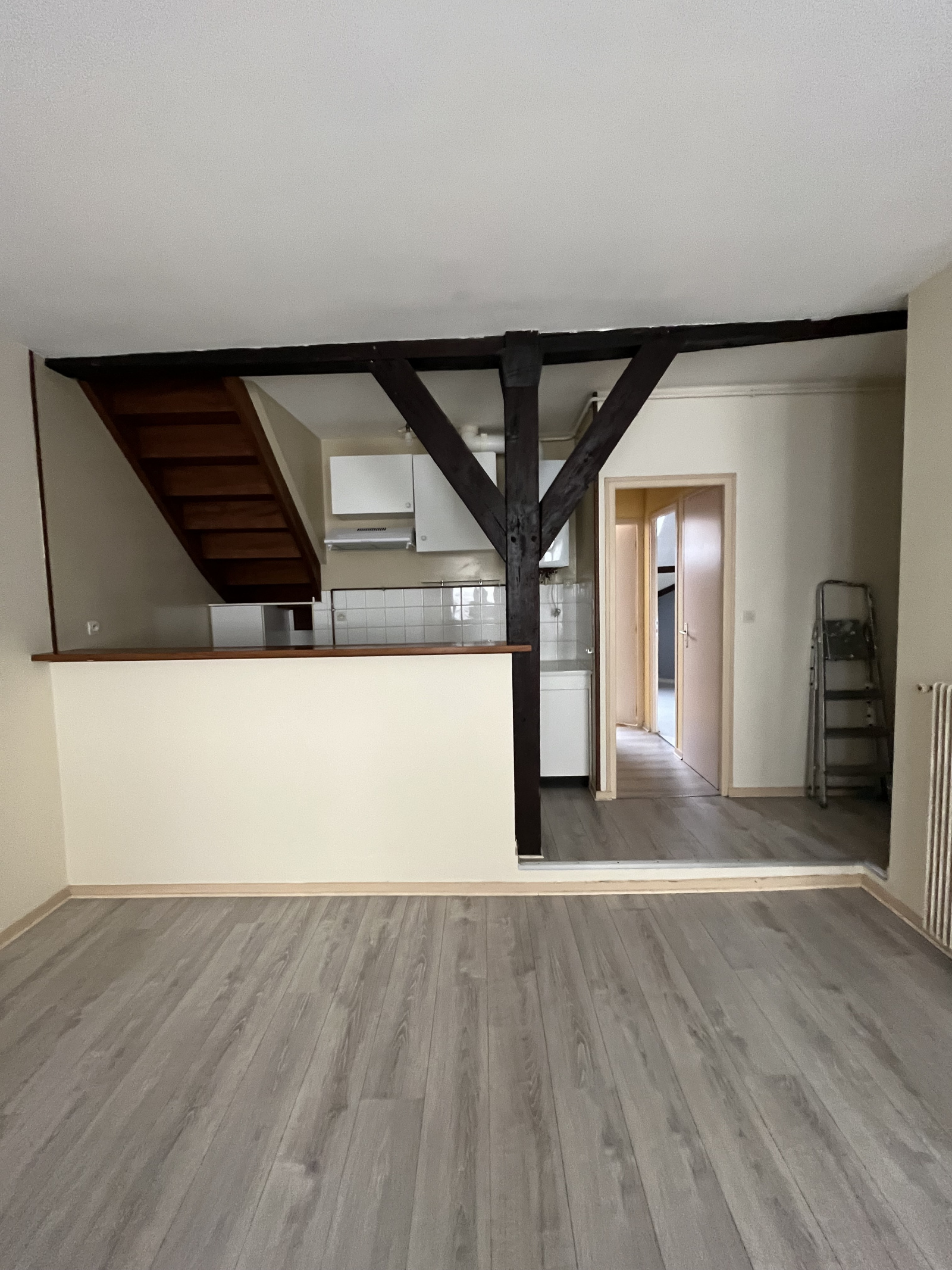 Cet appartement en duplex situé au 2ème étage sans ascenceur dispose d'une entrée, d'un séjour avec cuisine aménagée ouverte, d'un WC, d'une salle d'eau avec douche et d'une chambre au RDC. A l'étage, cet appartement dispose de 2 chambres.