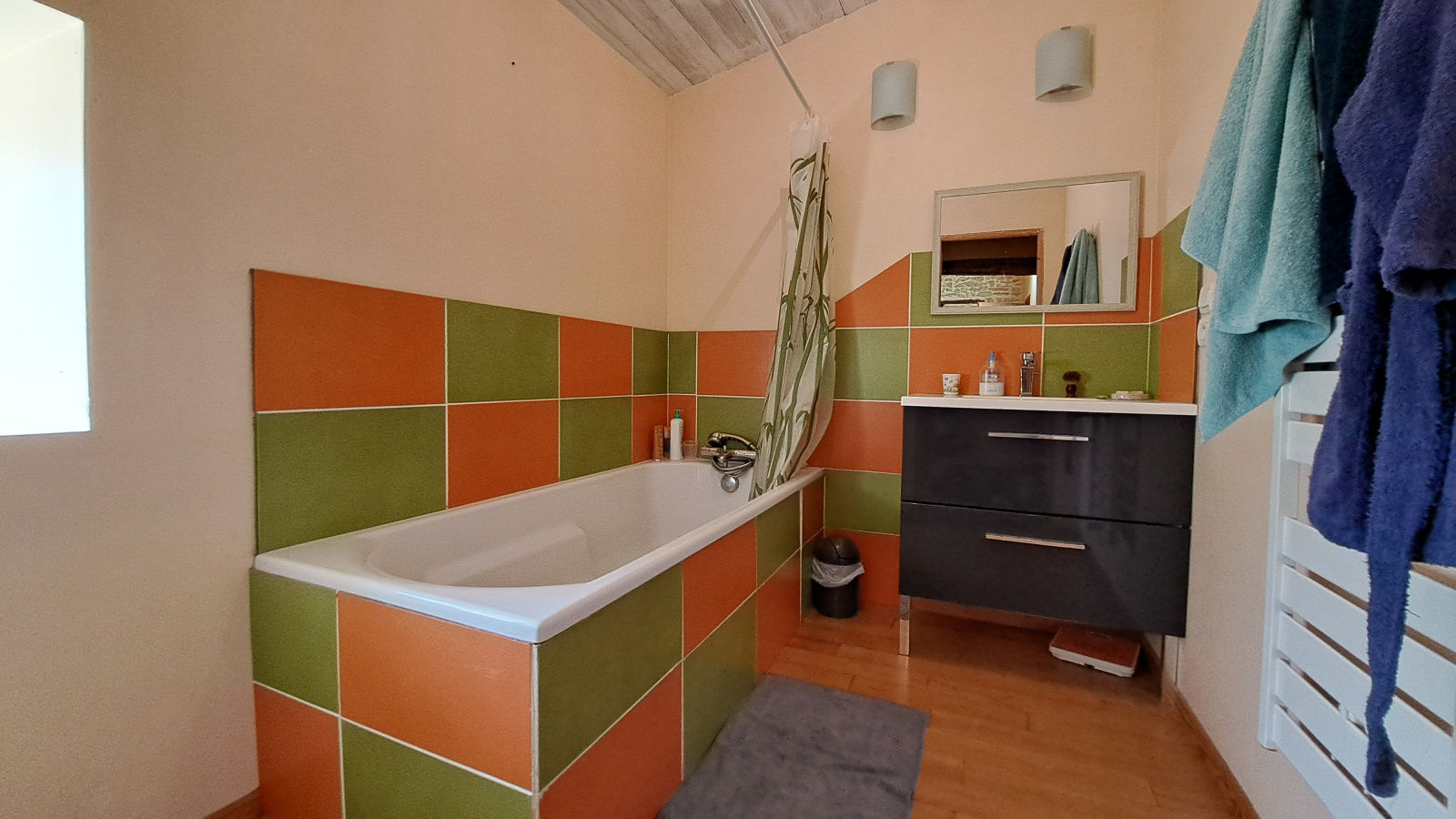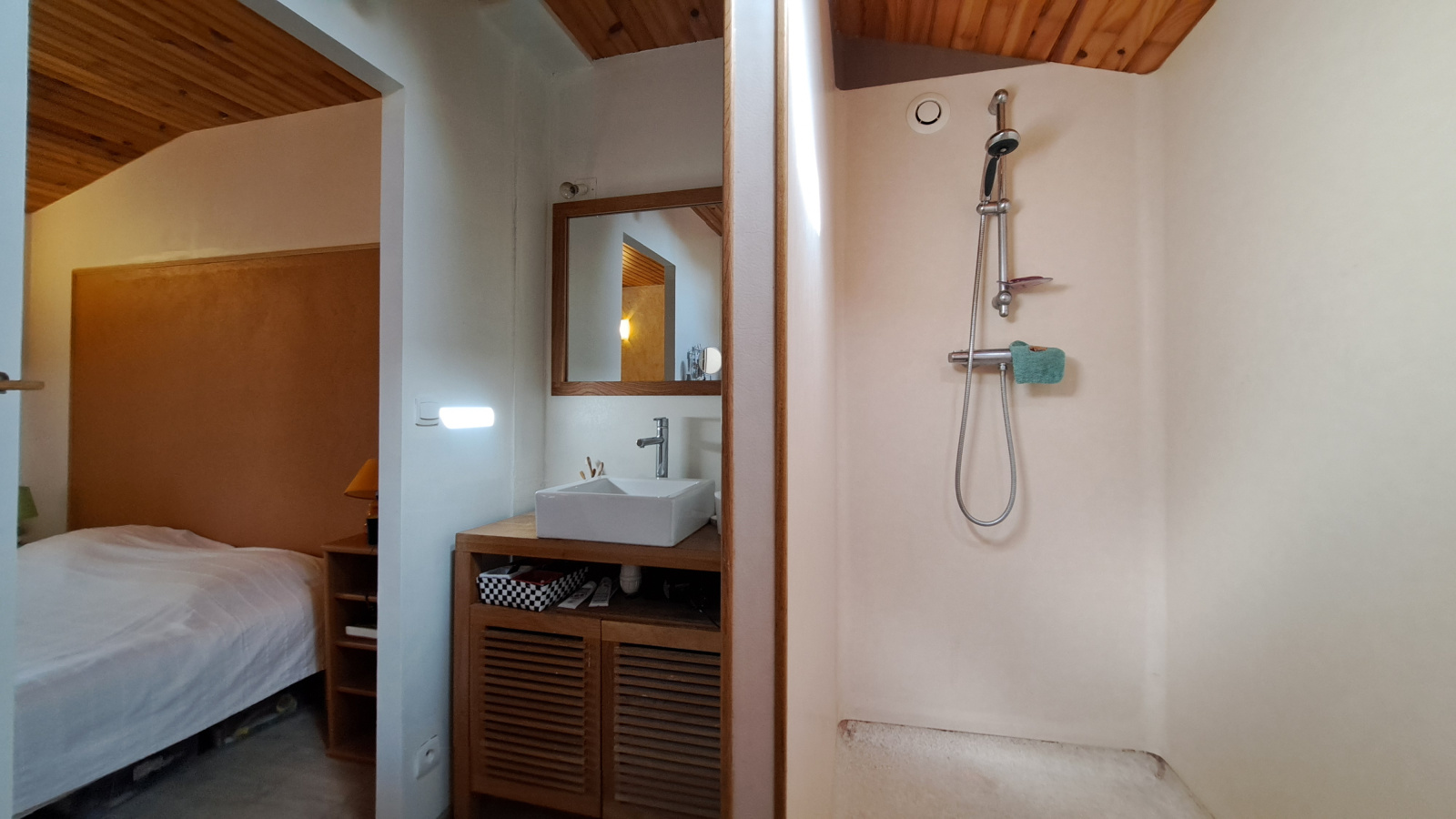 Cette maison dispose au RDC d'une entrée sur un séjour avec poêle à bois, d'une cuisine aménagée et équipée moderne, d'un cellier, d'un local rangement et d'un WC avec lave-main. Au 1er étage, cette maison dispose d'un pallier, d'une première chambre avec salle d'eau, de 2 autres chambres, d'une salle de bain et d'un WC. La maison dispose à l'extérieur d'une belle terrasse, d'un appenti pour 2 voitures et d'un abri de jardin. La maison est située dans un petit lieu-dit au calme avec vue sur notre campagne.