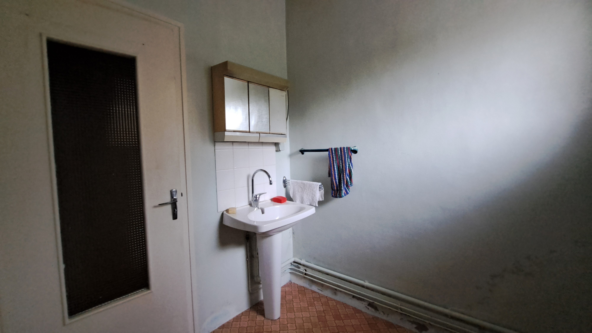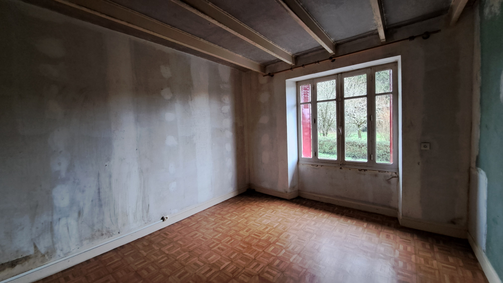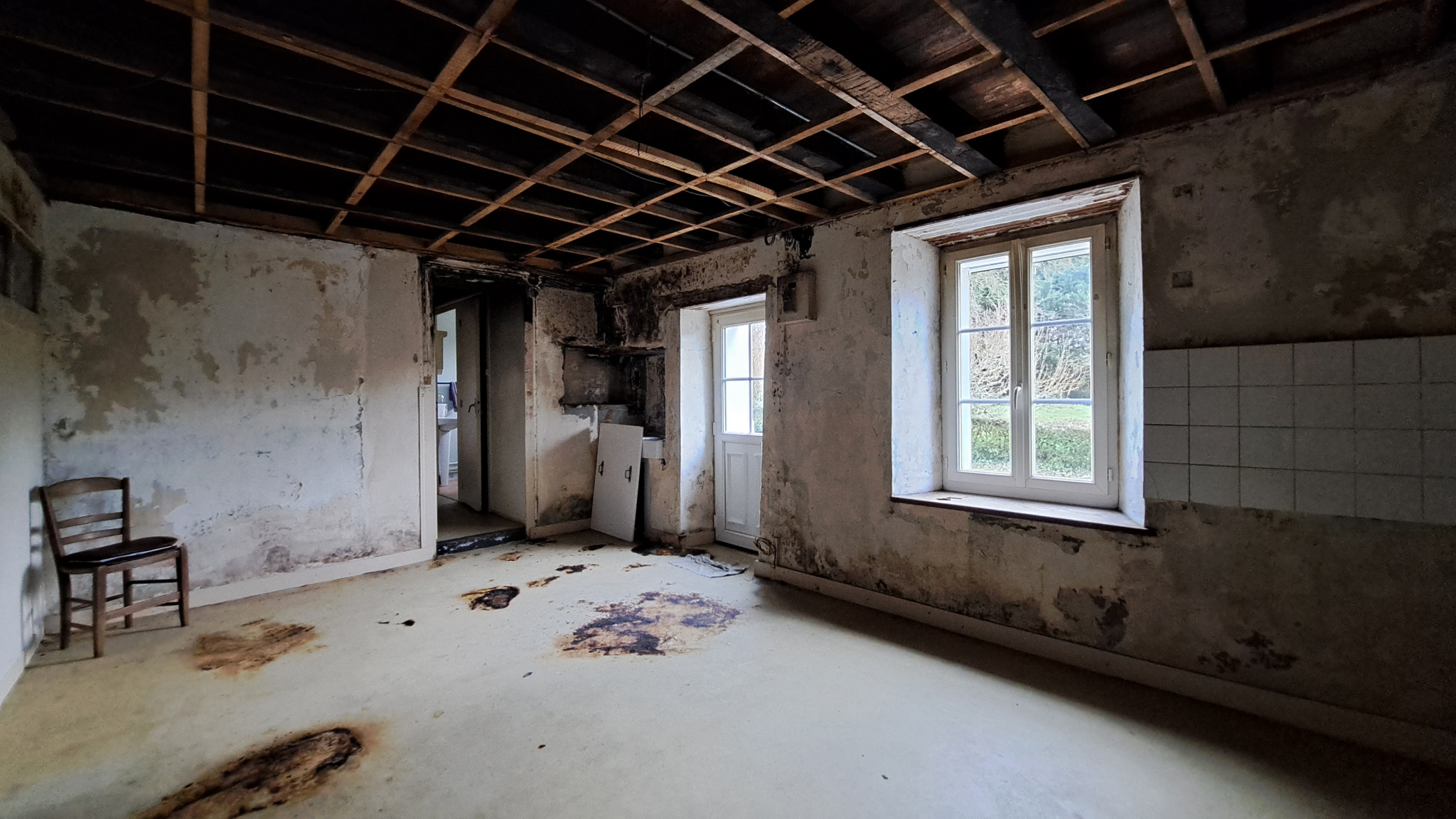 Cette maison à rénover dispose au RDC d'une entrée sur un séjour avec cuisine ouverte, d'une chambre, d'une salle d'eau avec douche à l'italienne et d'un WC indépendant. Au 1er étage, cette maison dispose d'une seconde chambre et d'un grenier aménageable en troisième chambre. La maison ne dispose pas de système de chauffage et de production d'eau chaude. A l'extérieur, l'ensemble comprend un local rangement et une grage en bon état de 74 m². Assainissement à prévoir, toiture en bon état, menuiseries à remplacer, système de chauffage et d'eau chaude à créer.