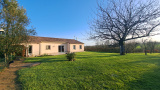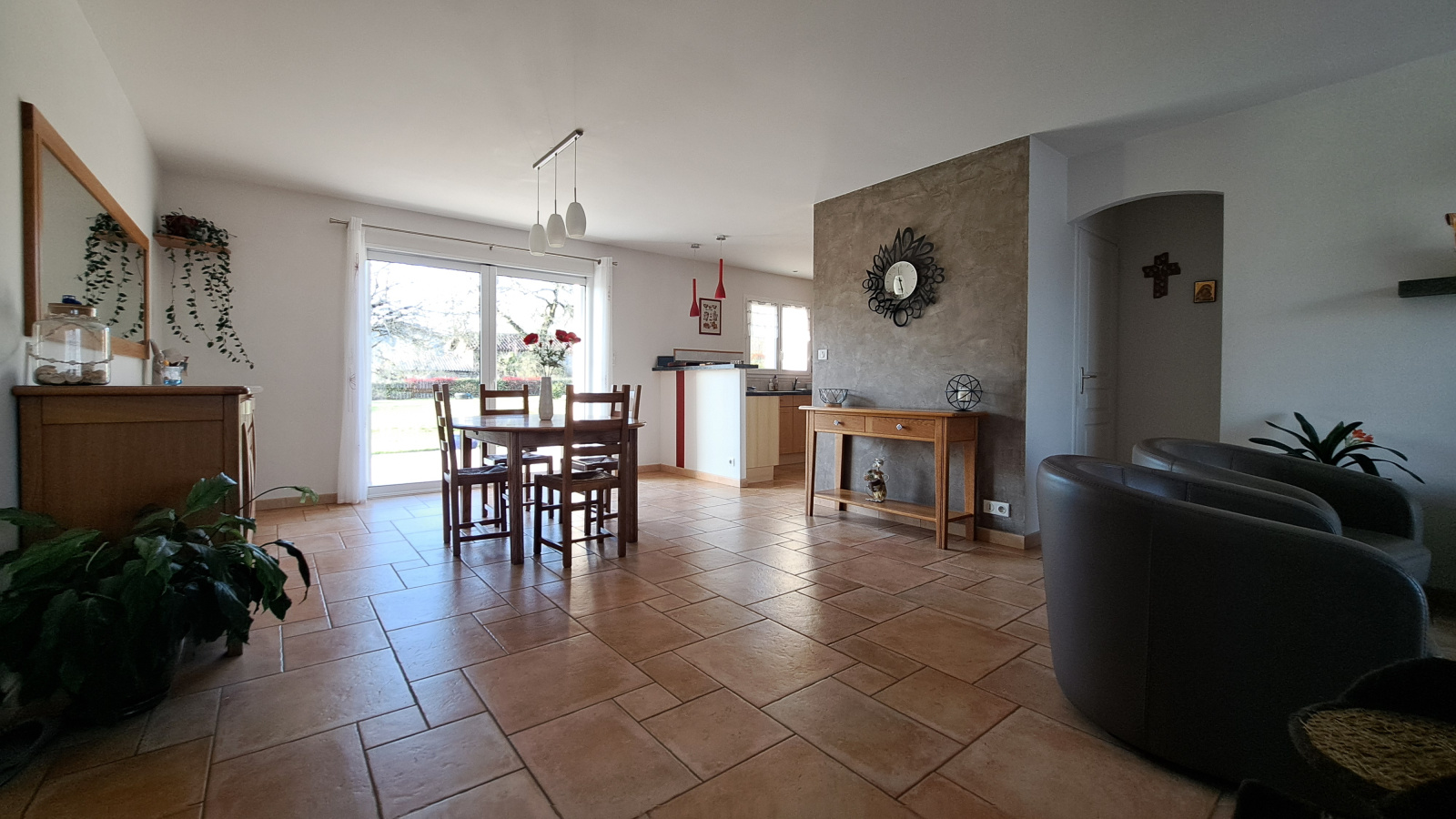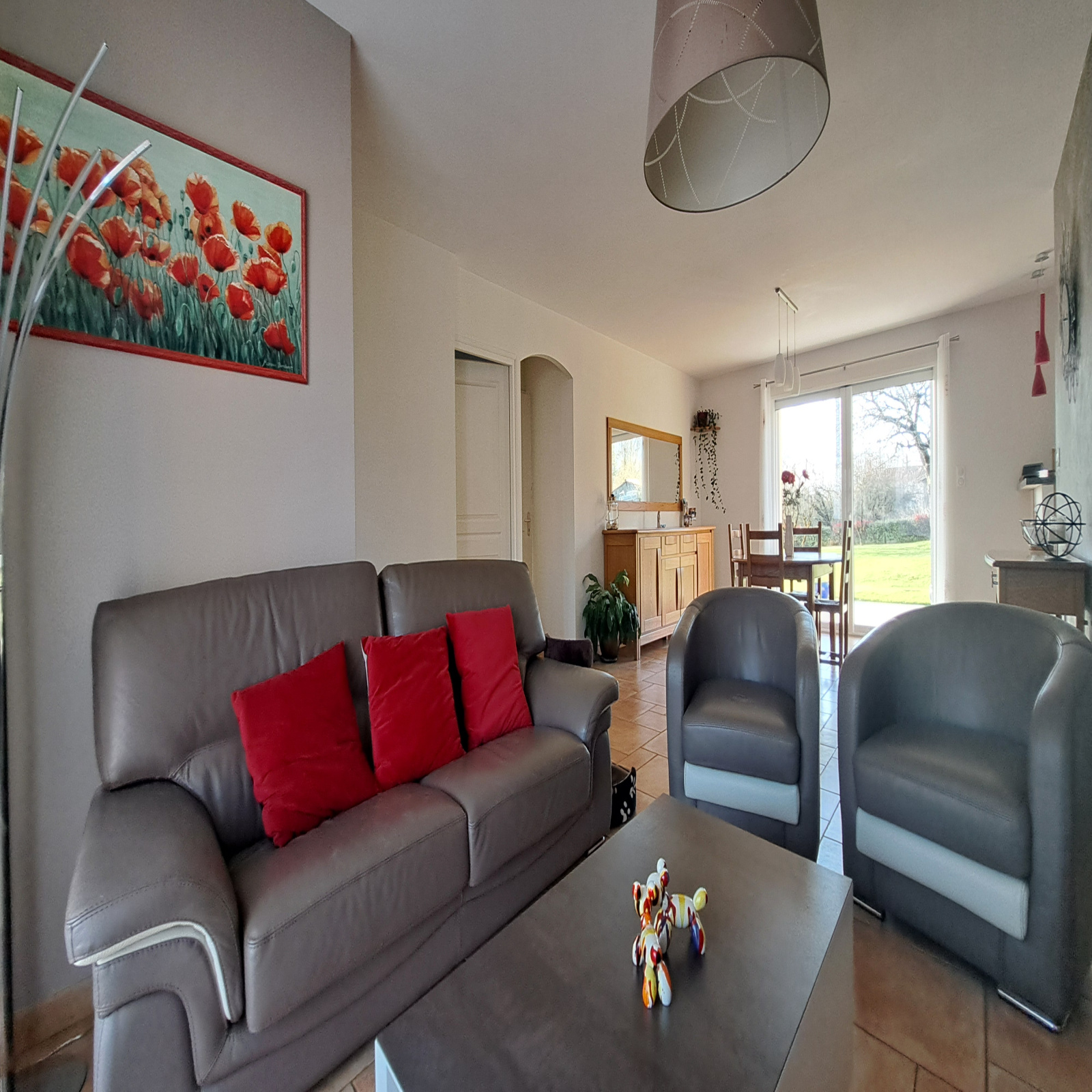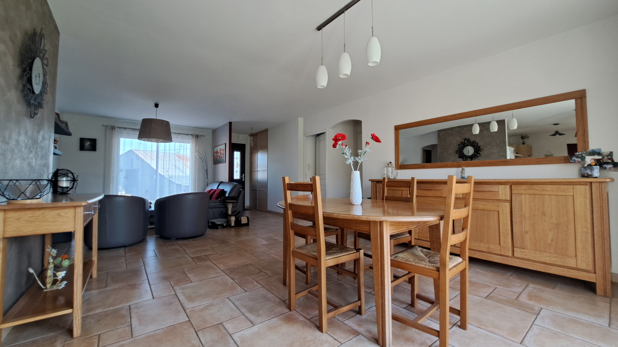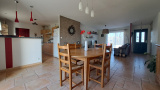 Cette maison de plain pied dispose d'une entrée sur un séjour lumineux avec cuisine aménagée et équipée ouverte, d'un cellier aménagé, d'une suite parentale comprenant une chambre et sa salle d'eau, d'un WC et d'un bureau. La maison dispose également de 3 chambres, d'une seconde salle d'eau avec douche et d'un second WC. La maison dispose d'un garage et d'un abris de jardin. Ce bien est en exelent état et ne demande aucun travaux. La toiture est conforme, système d'assainissement conforme, menuiseries en PVC double vitrage, plancher chauffant via pompe à chaleur.
