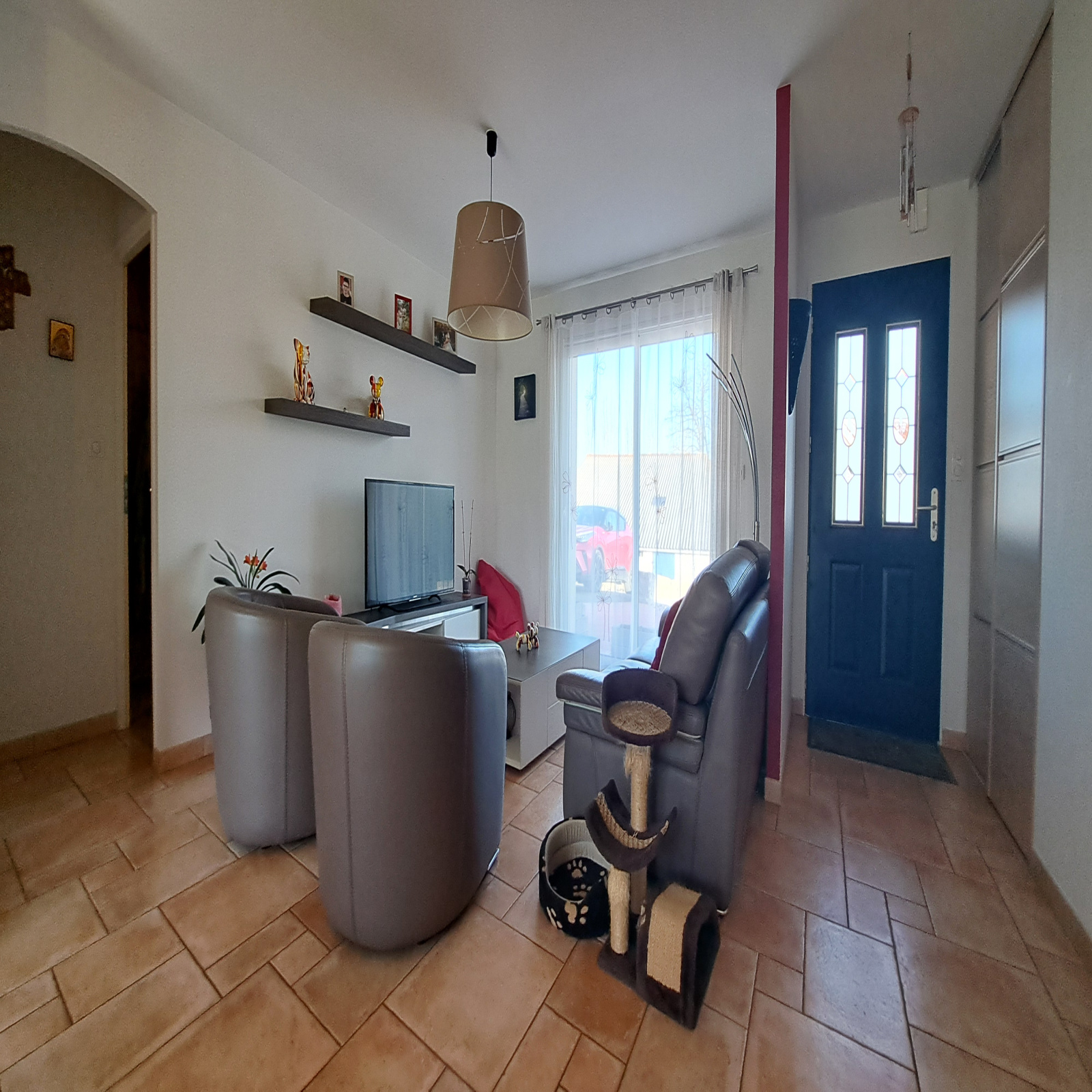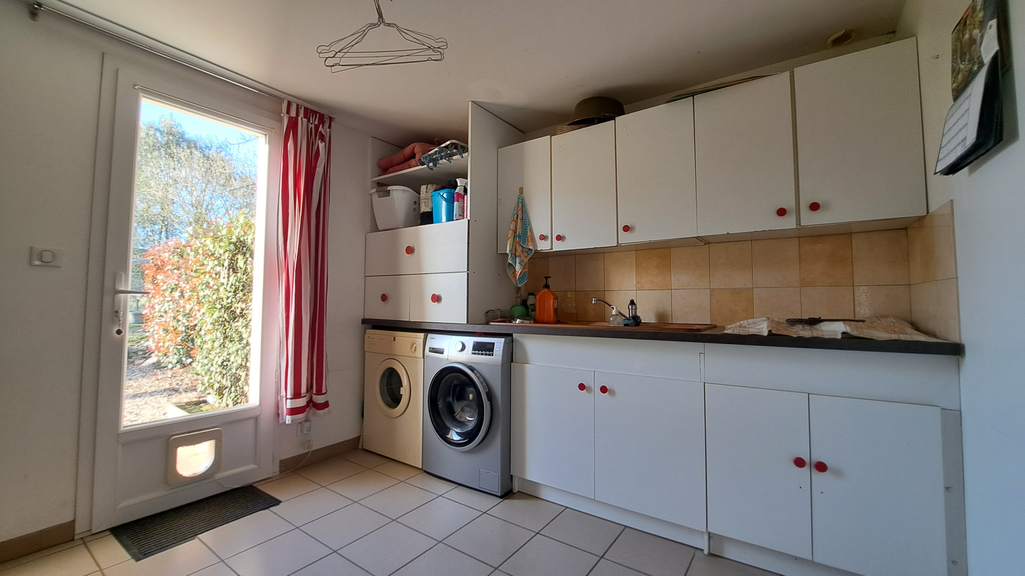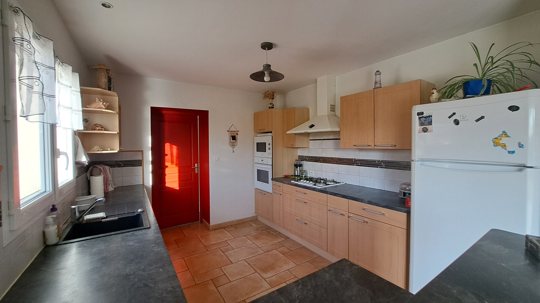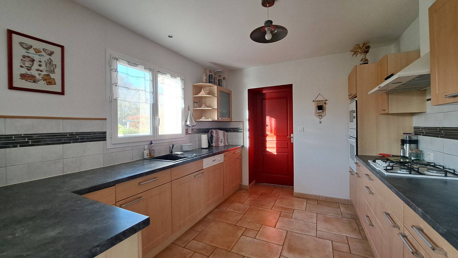 Cette maison de plain pied dispose d'une entrée sur un séjour lumineux avec cuisine aménagée et équipée ouverte, d'un cellier aménagé, d'une suite parentale comprenant une chambre et sa salle d'eau, d'un WC et d'un bureau. La maison dispose également de 3 chambres, d'une seconde salle d'eau avec douche et d'un second WC. La maison dispose d'un garage et d'un abris de jardin. Ce bien est en exelent état et ne demande aucun travaux. La toiture est conforme, système d'assainissement conforme, menuiseries en PVC double vitrage, plancher chauffant via pompe à chaleur.